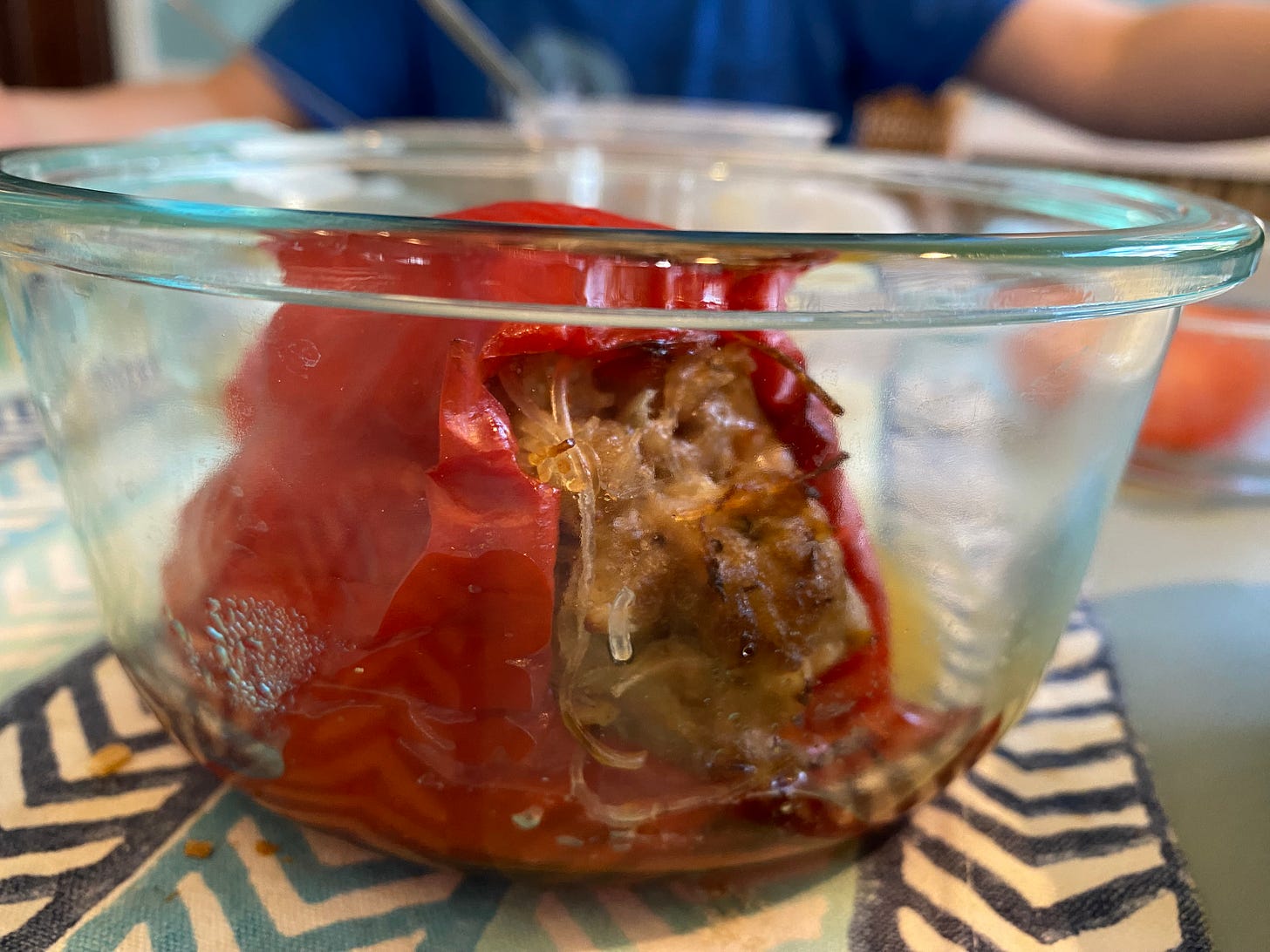 Stuffed bell peppers. I’ve barely been cooking lately (there’s been so much food from the in-laws and too much eating out this year), and even this only barely counts! But at our Lunar New Year celebration, my mother-in-law didn’t have time to make these stuffed bell peppers, but she’d already mixed and marinated the meat, so she sent the meat and bell peppers home with us so I could cook it. I stuffed the meat in the bell peppers, put it in a baking dish with a little water on the bottom (so any drippings wouldn’t burn), and baked it at 400F for about 45m, or until a probe thermometer registered at 165F.
