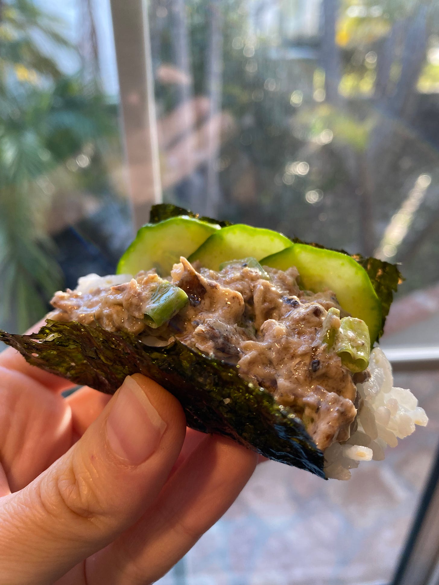Sardine salad “sushi”. This is on repeat around here, because it’s easy, healthy, tasty, and I always have all the ingredients on hand.